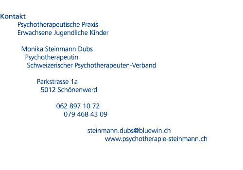 Impressum: Psychotherapeutische Praxis, Psychotherapeutin SPV Monika Steinmann Dubs / Parkstrasse 1a, 5012 Schönenwerd | webdesign: rucci.ch